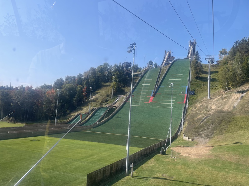 Die Adirondacks Mountains, im Nordosten der USA gelegen, ist ein riesiges Naturgebiet. Im Herzen liegt die kleine, aber feine Stadt Lake Placid. In den Jahren 1932 und 1980 fanden hier die olympischen Winterspiele statt. Heute ist das Gelände ein riesiger Freizeitpark, wir hatten die Gelegenheit genutzt, sind mit der Gondelbahn zur Sprungschanze gefahren und dann mit dem Aufzug in den Sprungturm. das war eine echt coole Sache!