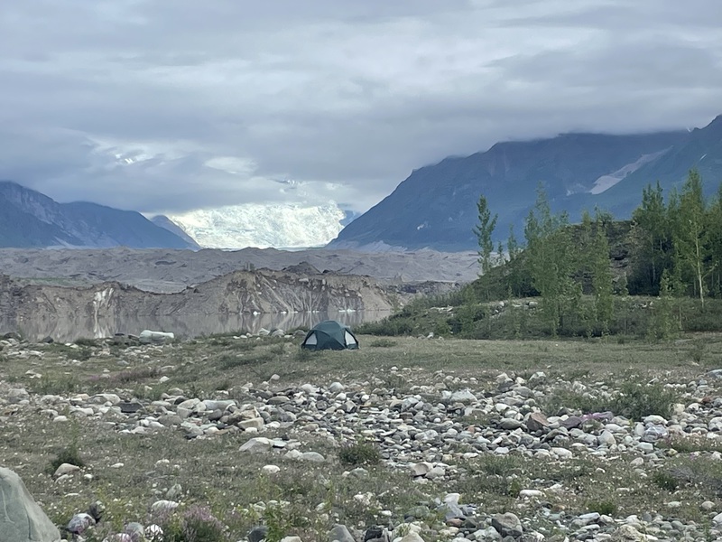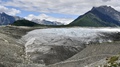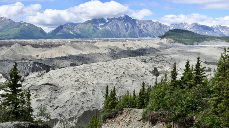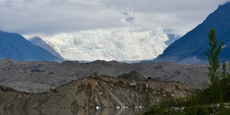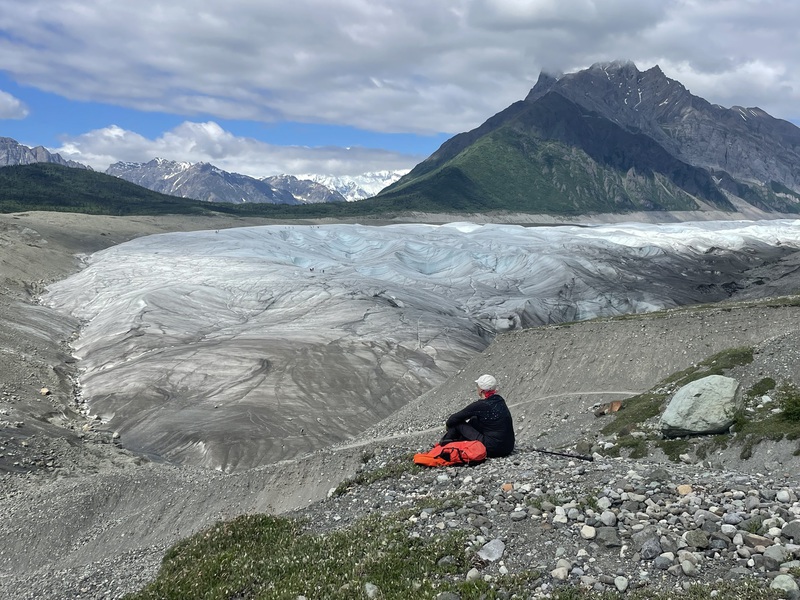 Wir wanderten von der Mühle an den Root Gletscher, hin- und zurück 10 Kilometer, um uns herum riesige schneebedeckte Berge der Wrangell Mountains.