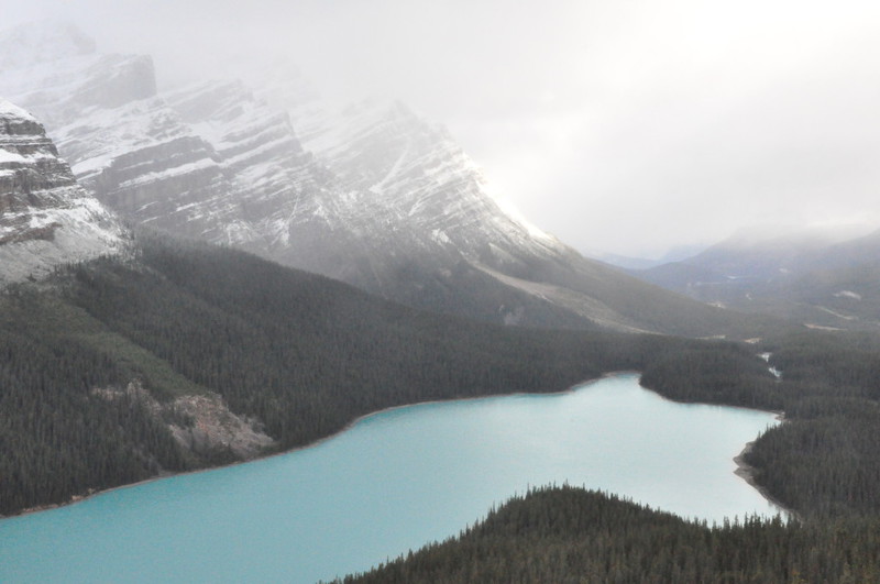 Der auf 2000 m Höhe gelegene Peyto-Lake ist umgeben von dichten Kiefern-wäldern oberhalb des Sees liegt der riesige Gletscher und unterhalb wird er von einer Endmoräne aufgestaut. Da der Wasserzulauf des Sees im Winter zufriert, jedoch der Ablauf eisfrei bleibt, ist oft im Winter kein Wasser vorhanden, jedoch im Sommer verleihen ihm die Sedimente ein tiefes türkischgrün, welches den See zum Postkartenmotiv macht.