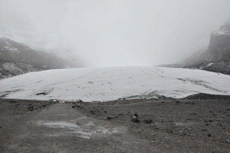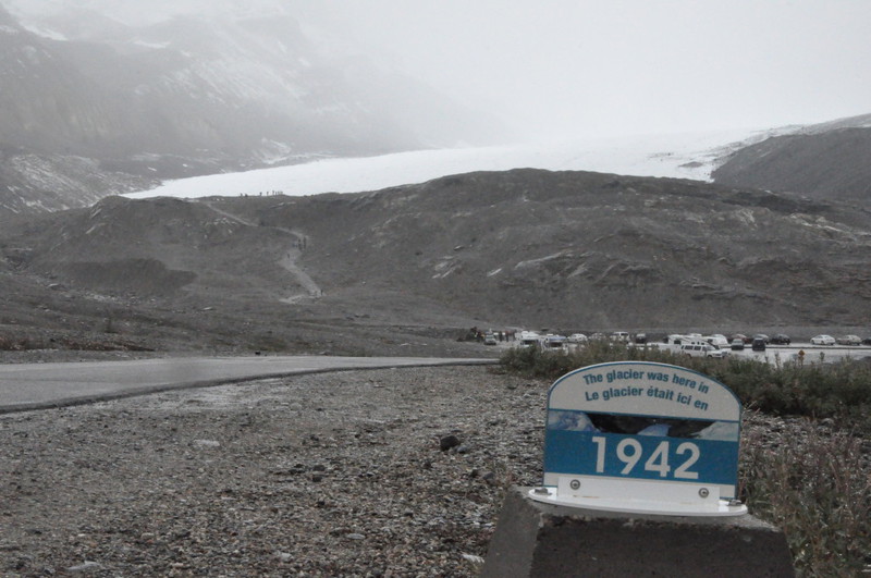 Das Columbia-Icefield versetzte uns jedoch einen Schrecken! Jahr für Jahr wird es ein Stück kleiner! Für uns war es schon sehr traurig an den aufgestellten Jahreszahlen zu sehen, wie das Icefield immer schneller schrumpft. Um so zweifelhafter erschien uns die Möglichkeit in monströsen Bussen, für viel Geld, über den Atabasca-Gletscher zum dahinterliegenden Icefield zu gelangen.
