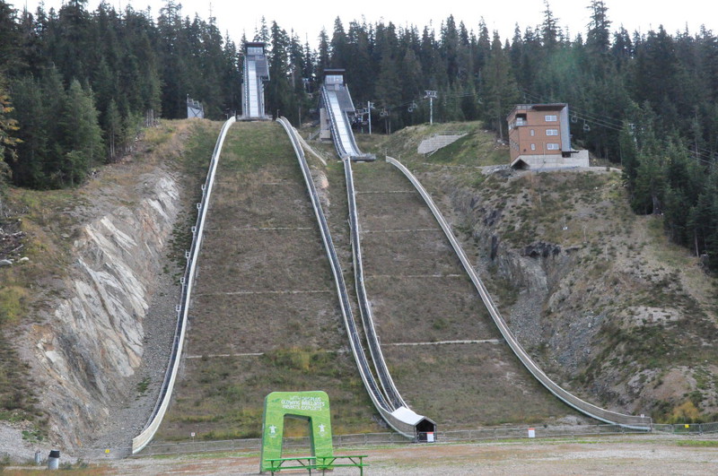 die Stadt mit ihren vielen, neu gebauten Hotels sehr steril, die Cafès waren gefüllt mit Immobilienmaklern, die versuchten, die lehrstehenden Appartments zu verkaufen. Aber vielleicht ist ja im Winter hier mehr los. Wir entschieden uns den ca. 10 km entfernten Whistler Olympic Parc ausgiebig zu besuchen. Nach einer steilen Anfahrt erreichten wir den Eingang, wo wir beim Volunteer ein freiwilliges Eintrittsgeld bezahlten.