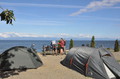 wechslung von unserem Radalltag. Auf der Fähre lernten wir Sandra und Stefan kennen, die auf dreiwöchiger Radtour durch B.C. sind. Bei der Ankunft hatten wir noch tolles Wetter, wir radelten gemeinsam zum nächsten Campingplatz und genossen den herrlichen Nachmittag. Abends wurden wir alle von einem kanadischen Ehepaar die mit ihrem Motorhome neben uns standen zu einem Glas Wein eingeladen. Noch in der Nacht schlug das Wetter um und es begann stark zu regnen. Unter dem Motto "geteiltes Leid ist halbes Leid" radelten wir über den stark befahrenen Hyw 19 Richtung Nanaimo. Bei einer Kaffeepause am späten Nachmittag, trafen