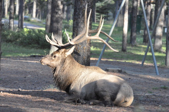 Der Name Wapiti stammt von den Shawnee - Indianern und bedeutet "weißes Hinterteil". Wapitis gehören zur Gruppe der Rothirsche und sind mit einer Schulterhöhe von bis zu 1,5 m und ihren 450 kg Gewicht mächtige Tiere. Sie leben ausschließlich auf dem nordamerkanischen Kontinent, Unterarten sind in Asien vertreten. Die ersten von ihnen trafen wir im Yellowstone N.P. und später auf dem Campground bei Jasper in Canada. Dort war es besonders spektakulär, sie waren gerade in der "Rutting Season"(Brunftzeit).