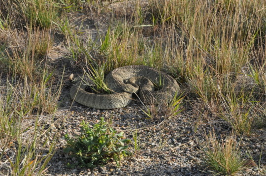 Die Arizona-Klapperschlange gehört, mit einer Länge bis zu 2 m, zu den größten ihrer Art. Leider erreichen sie diese Größe nur selten, da die Schlangen den warmen Straßenbelag lieben und dadurch direkt vor die PKW's kriechen. Unsere erste Schlange trafen wir im Joshua Tree N.P., lebend mitten auf der Straße. Alle versuche sie auf die Straßenseite zu locken, ohne ihr zu Nahe zu kommen, scheiderten. Zum ihrem Glück war zu dieser Jahreszeit nicht so viel Verkehr im Park. Die zweite Begegnung war schon etwas kritischer, als wir durch Wyoming radelten, stellte sich eine, blitzschnell, aus dem Gras hoch fauchte und klapperte
