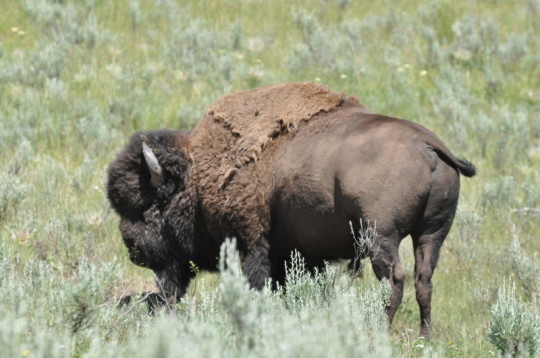 In der Weite des Yellowstones sahen wir das erste Mal friedlich grasende Bisonherden, wir machten einige tolle Fotos von ihnen. Am nächsten Morgen änderte sich unser Bild über sie. Wir waren im Dunkeln auf dem Weg zum "Old Faithful", als plötzlich eine Herde von ca. 20 Tieren vor uns auf der Straße stand. Die Bullen, wie versteinert mit starren Blick, die Mütter mit ihren Jungen nervös. Wir hielten sofort an wussten nicht wie wir uns verhalten sollen. Einfach durch die Herde durchradeln? Nach zehn langen Minuten des Wartens näherte sich ein Auto, unsere Lösung! Wir unterhielten uns kurz mit dem Fahrer und im Schutze des PKW's konnten wir im Slalom die Herde passieren. Trotzdem war unser Puls auf 360 und die Zeit kam uns unheimlich lang vor, bis wir durch waren. Das war schon eine mulmige Angelegenheit. Später erfuhren wir, dass es durch Bison's mehr Verletzte gibt als durch jedes andere Wildtier. Ihre Beschleunigung beträgt schon mal bis zu 45 km/h.