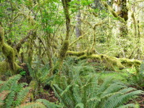 waldes, die mit Moos ueberwucherten Baume, Farne und unzaehlige Wasser-