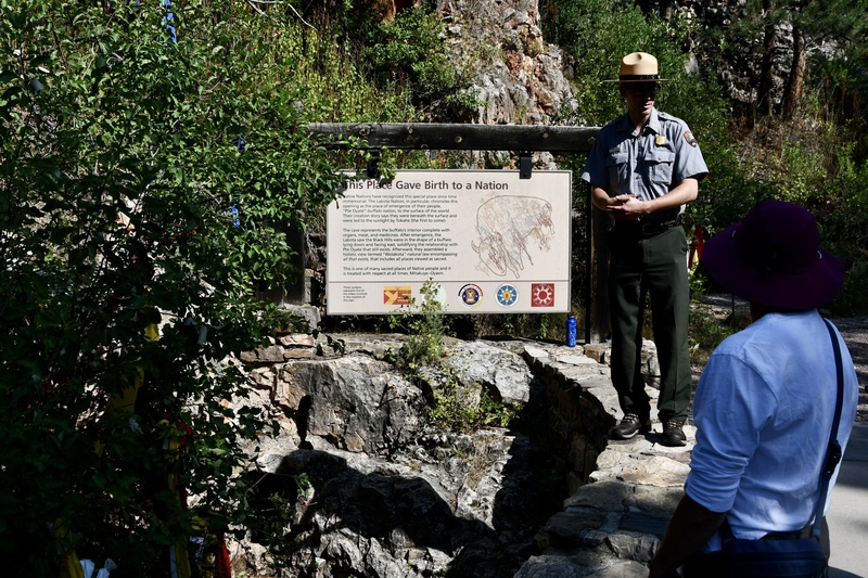 In dem kleinen aber feinen Park ist nicht nur eine Höhle, die drittgrößte der USA und eine der ältesten weltweit, auch die Landschaft mit den endlosen Prärien und riesigen Bisonherden locken jährlich sehr viele Besucher an. Leider ist die Höhle seit dieses Jahr geschlossen, denn der Aufzug der ins Innere führt ist sanierungsbedürftig. So konnten wir nur den Notausstieg besichtigen, der heute noch als Zeremonieplatz der First Nations genutzt wird.