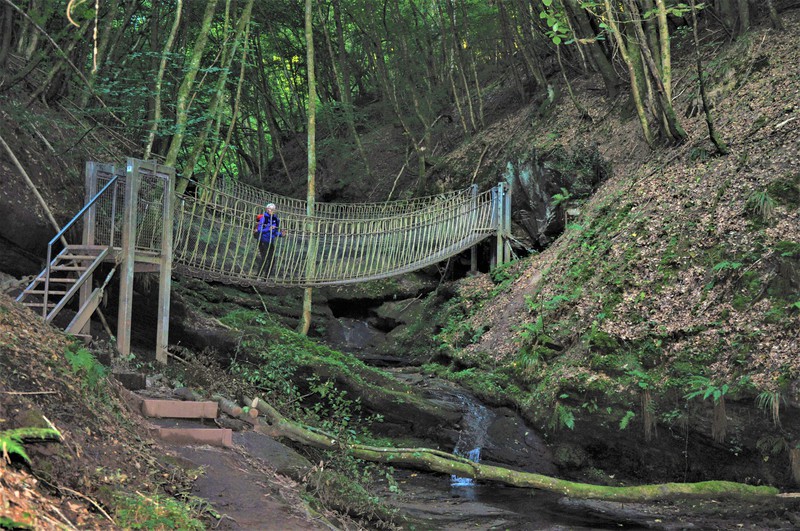 Der Römerpfad führt durch eine spektakuläre Schlucht, vorbei an Wasserfällen und einem sich selbst überlassen Wald. Nach einem kurzem Stück erreichen wir die 2 geteilte, 30 mtr lange Hängebrücke eine der vielen Höhepunkte der Tour. Die Schlucht ist so toll, das man am liebsten immer weiter laufen möchte. Auch der Anstieg hinauf zu dem römischen Bergwerk bereitet Freude, das von römischen Sklavenhänden geschaffene Bergwerk ist sehr beeindruckend und zeugt von der frühen Nutzung des Gebietes. Der Aussichtspunkt "Geyerslay" bietet einen tollen Blick auf die Burg und ins Tal bis nach Kordel.