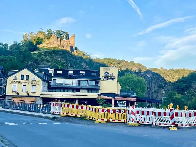 Los gings, gesagt getan, nach 2 Stunden Fahrt sind wir in Altenahr angekommen, wo wir auch sofort einen Stellplatz fanden. Leider machte es uns sehr betroffen, den es war einer der Orte die beim Eifelhochwasser, Juli 2021, am stärksten betroffen war. Die Kirche, der Friedhof, die Straßen und Brücken komplett sind noch nicht instandgesetzt, oder wurden komplett zerstörrt. Viele Hotels, Weingüter, Häuser und Geschäfte waren bis in die 2 Etage überflutet und nicht mehr zu nutzen, es gab auch einige Tote im Ort zu beklagen. Lediglich zwei, drei Gaststätten sind mittlerweile renoviert und in Betrieb. Es ist erschreckend, dass nach 2 Jahren ein ehemaliger Touristenmagnet noch so kaputt ist. Unser Stellplatz ist auf dem ehemalige Busbahnhof wo ein gerade Fläche für Camper geschottert wurde, um den Tourismus wieder in den Ort zu bringen.